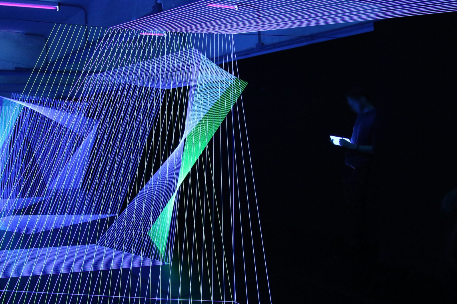Created with threads sourced from her native South Korea, Choi’s installations are the result of deliberate and precise calculation and planning. Sometimes, when inspired by the situation to draw directly into the space, Choi walks through the room with a literal thread in her hand to search for new forms in her own movements. Similarly, as viewers walk through the installation, they follow Choi’s steps as they experience and interpret the work. Inside the immersive environment of Choi’s installation, UV lit threads seem to vibrate, creating a doubling effect as each eye sees the composition from a slightly different angle.
